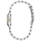Details: Stainless steel case with blue faceted mineral glass dial to convey a 3-D look. Embellished with 120 Swarovski Crystals on the stainless steel case and bracelet with a short fold over buckle with pushers, flat mineral crystal, water resistance to 30 meters.