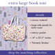 Book tote bag measures 14.75 inches (37.5 cm) by 14 inches (35.56 cm) and a depth of 4 inches (10.2 cm) to easily hold clothes for a weekend getaway or all your favorite books for a trip to the library