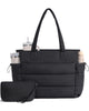 Smart Organization: 16" x 6" x 12", capacity 20L. This quilted utility shoulder bag holds everything in its place with 9 pockets (4 exterior + 5 interior), including a padded laptop sleeve (fits up to 15"), quick-access phone/keys slots, and a matching makeup pouch for your lipstick, suncream and other small items.