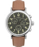 Details: This Timex watch features a stainless steel round case, adjustable leather wrist strap, and black dial face with INDIGLO lighting. Traditional buckle closure. Three-hand analog display with quartz movement. Dial face features Arabic numerals, minute track at perimeter, and brand name. Splash resistant up to 3 ATM/30 meters. Presentation case included. Imported.