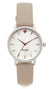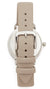 This watch features a round 34mm case, 16mm band width, mineral crystal, quartz movement with three-hand analog display, imported